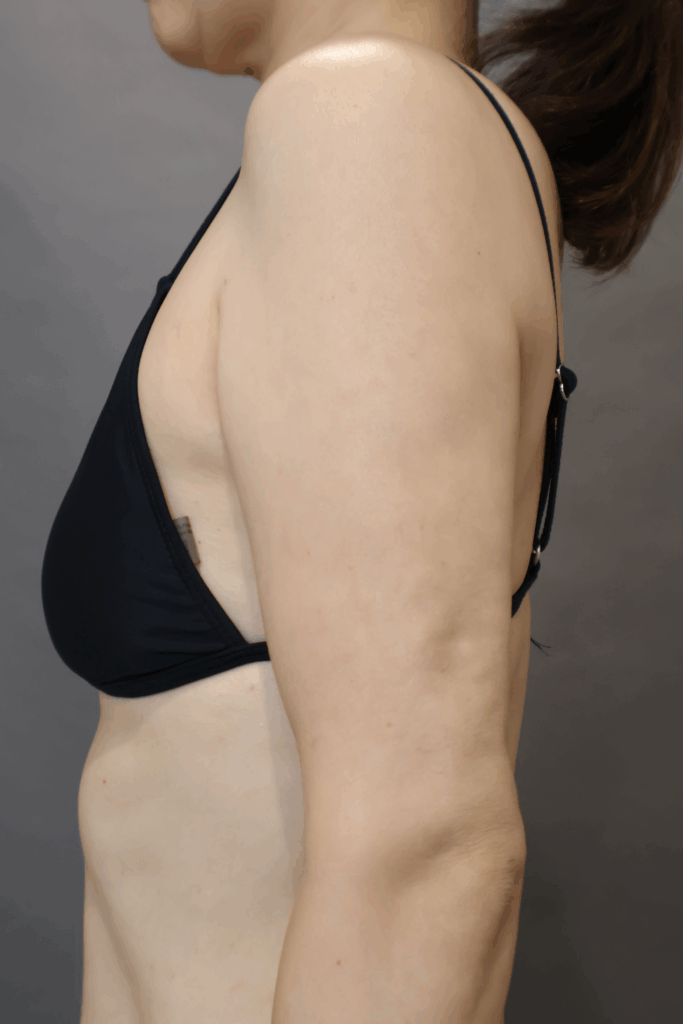 二の腕の過度の脂肪吸引により、左腕に引き攣れが生じています。
