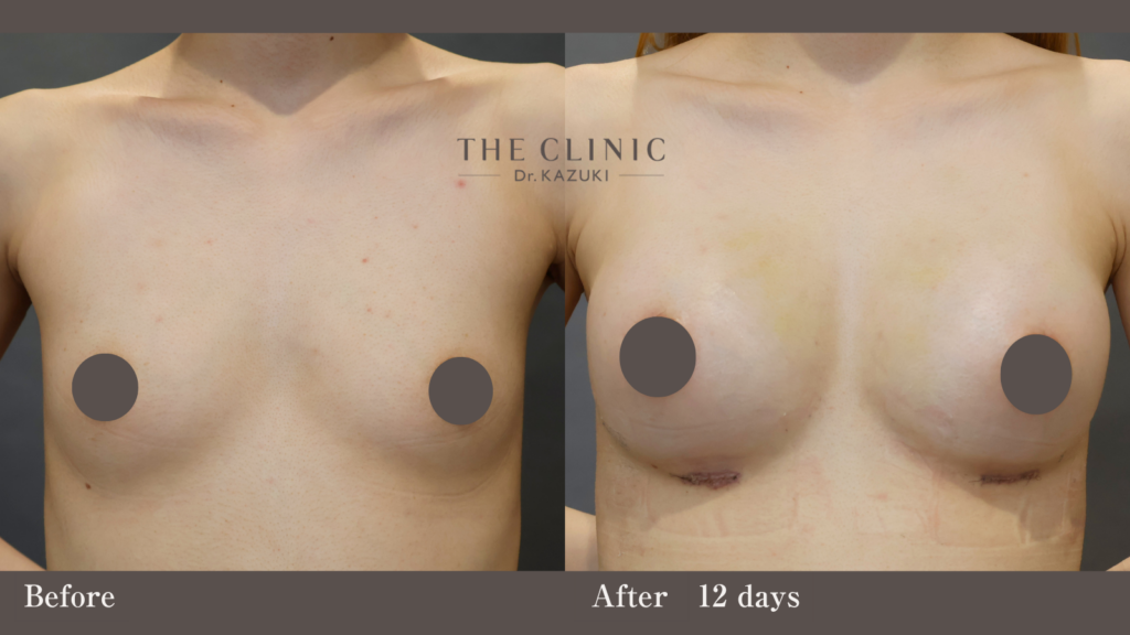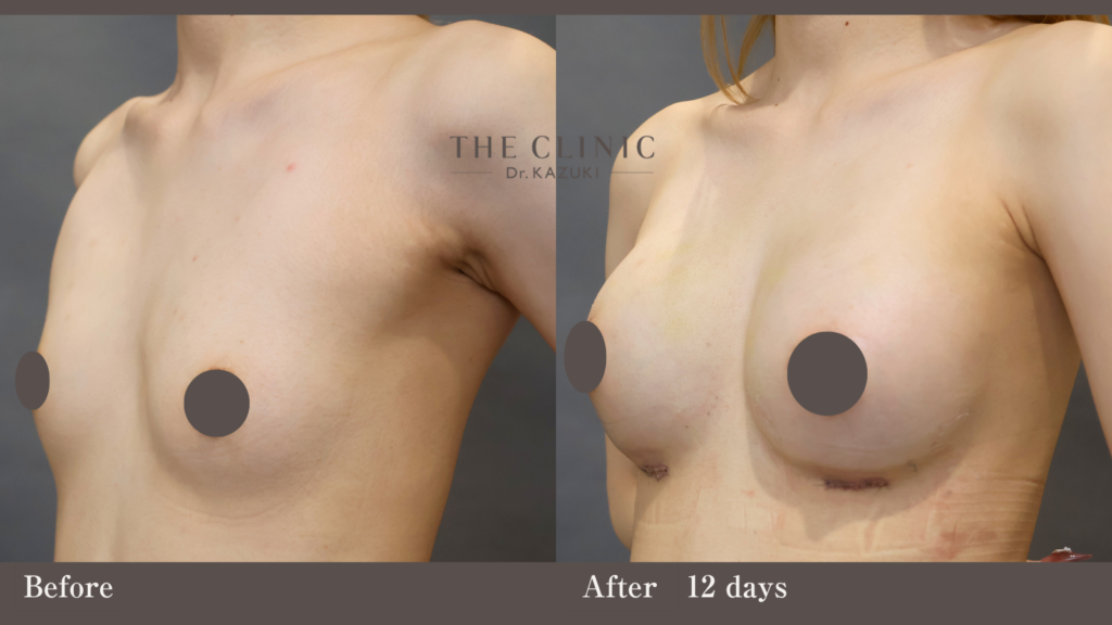 術後12日目は、まだ全体的に「張り感」やむくみが強く残る時期です。徐々に組織が馴染み、さらに自然な垂れ感と柔らかさへと変化していきます。バストの形を安定させるため、医師の指示通りワイヤーレスのブラジャー等で適切な圧迫・固定を継続してください。