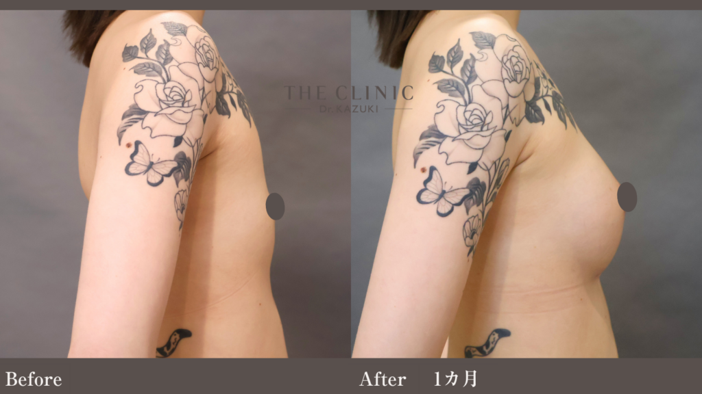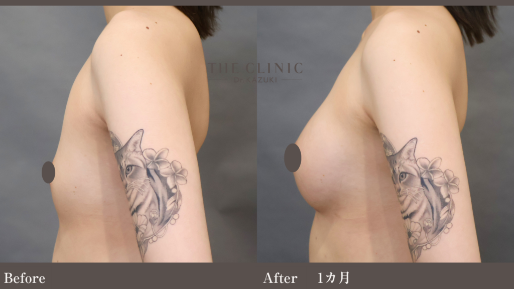 横からのライン: 術前と比較して、乳頭の位置が上がり、ツンと上を向いた美しいサイドシルエットに変化しました。