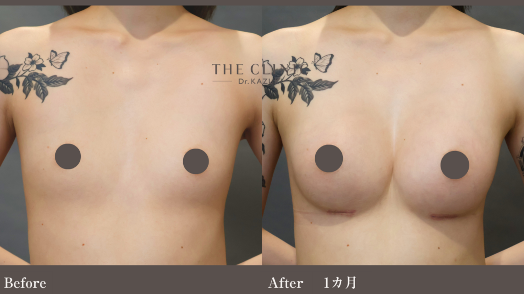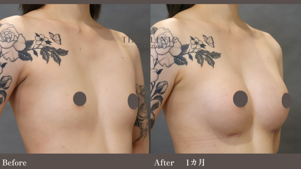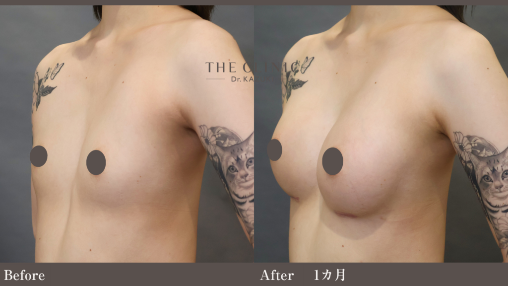 術後1ヵ月のため、まだ多少の硬さがありますが、時間の経過とともにさらに馴染んで柔らかくなります。一時的な内出血や腫れは数週間で落ち着きますが、定着を促すため数ヶ月は強い圧迫を避けることが大切です。