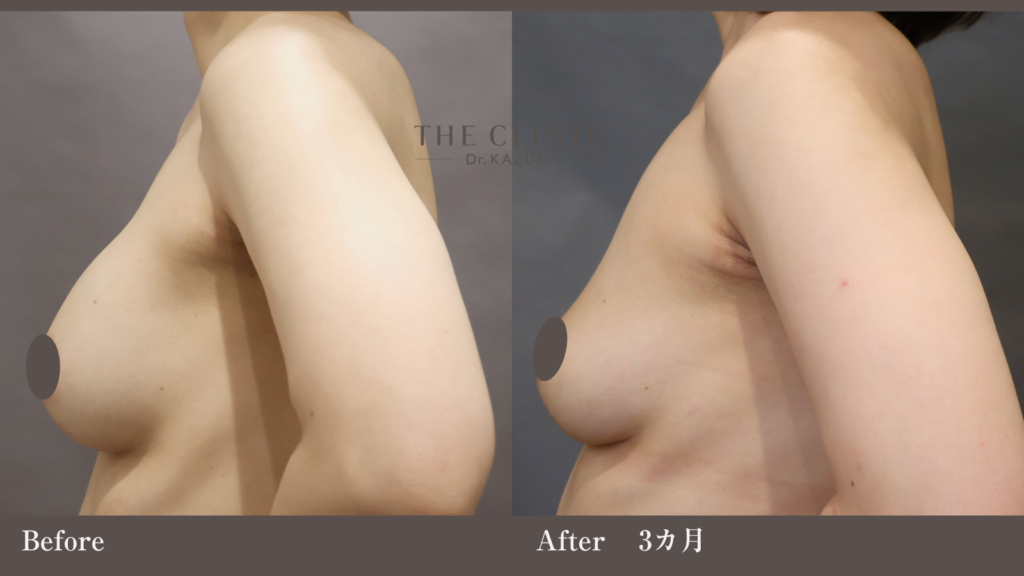 大腿後ろ半周(膝内を含む)からベイザー脂肪吸引を行い、シリコンバッグ(150ml: 大胸筋下)を取り出した後、コンデンスリッチ脂肪豊胸を行っています。