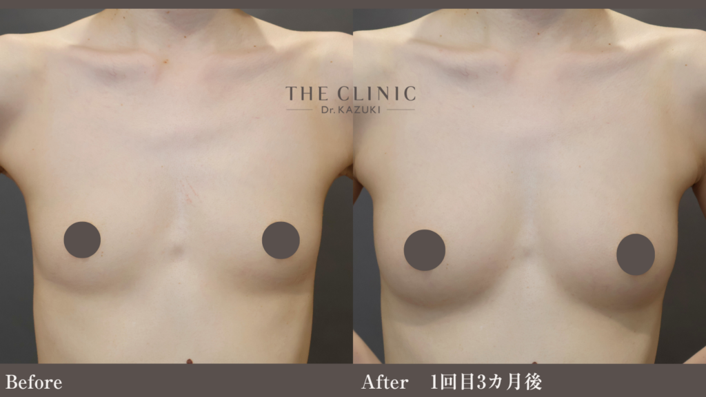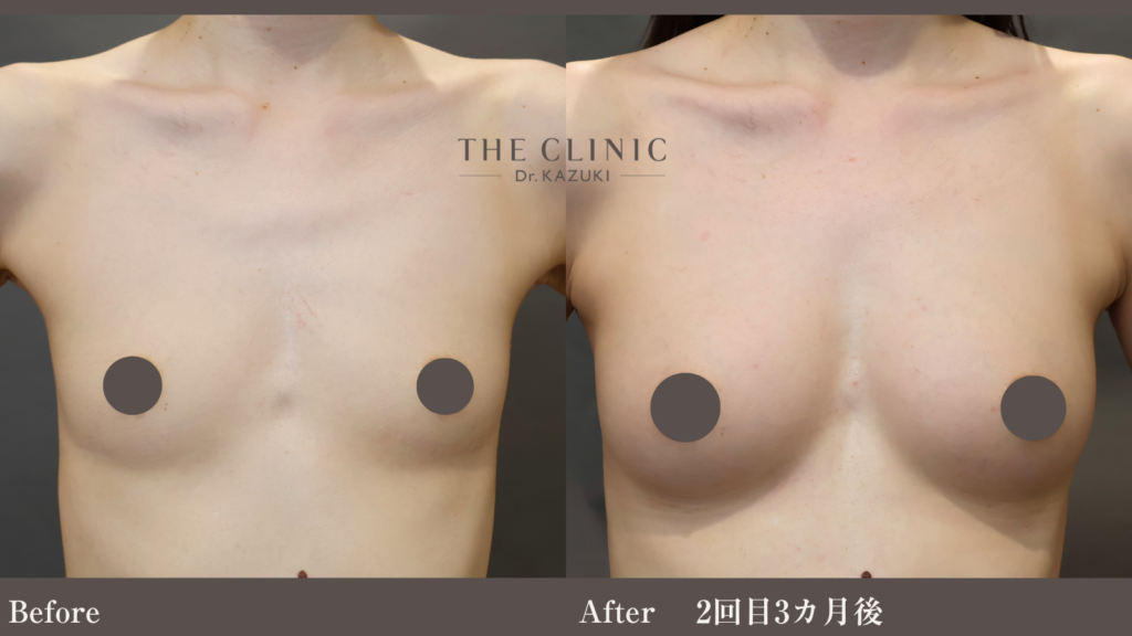 1回のコンデンスリッチ脂肪豊胸でもしっかり大きくなりましたが、さらなるボリュームアップの為、2回目の豊胸を行いました。リゴトミーでバストの半径を大きくしたこともボリュームアップの主因です。