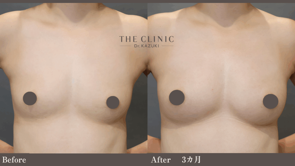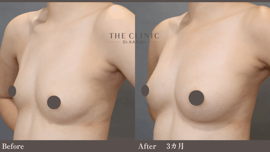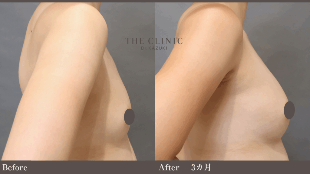 2cupアップしています。下縁を脂肪注入のみで伸ばそうとすると、どうしても下縁のくっきりした感じが薄れてしまいます。リゴトミーで下縁の結合組織を鋭的に断ち切ることで、くっきりとした立ち上がりに仕上げます。