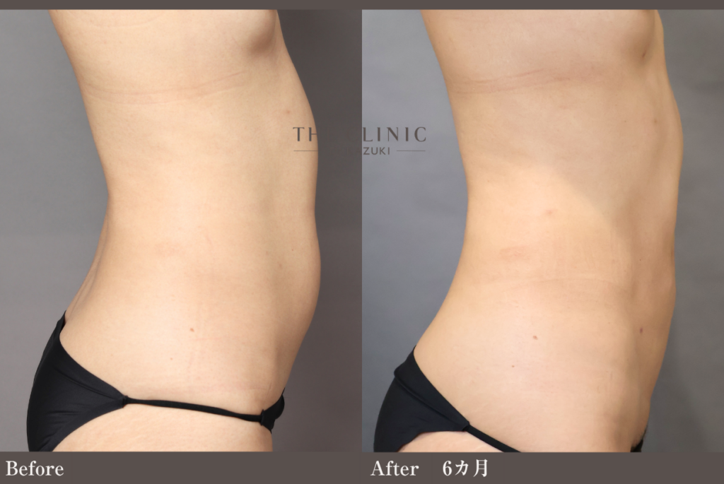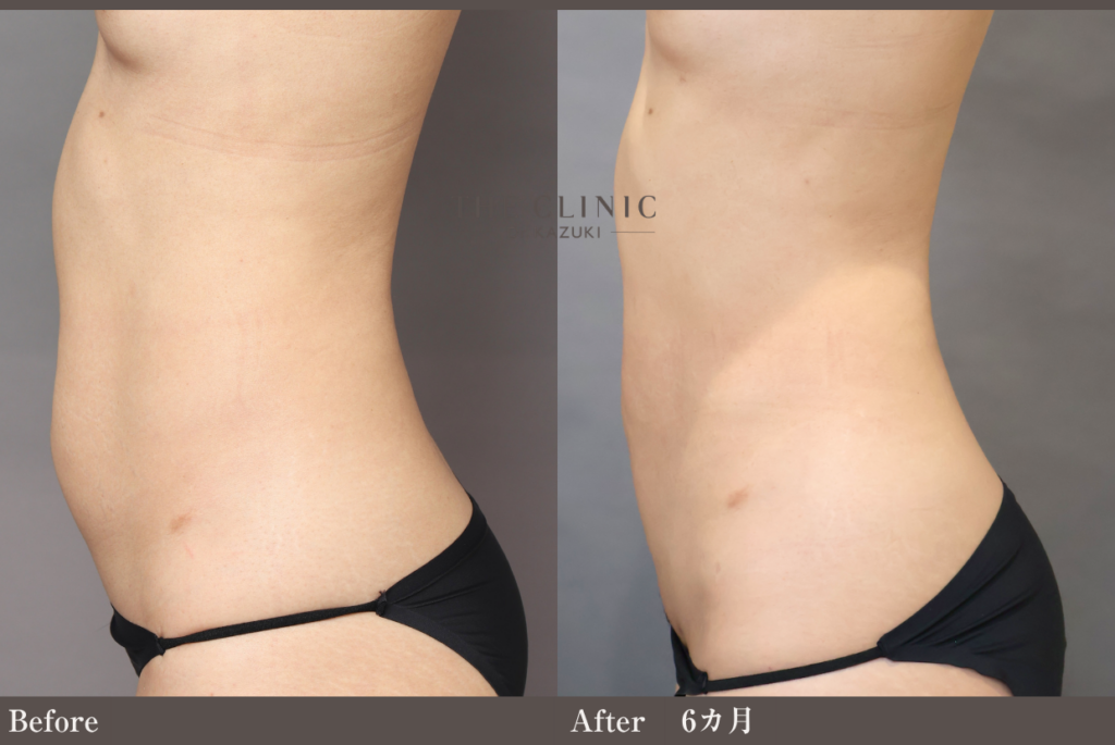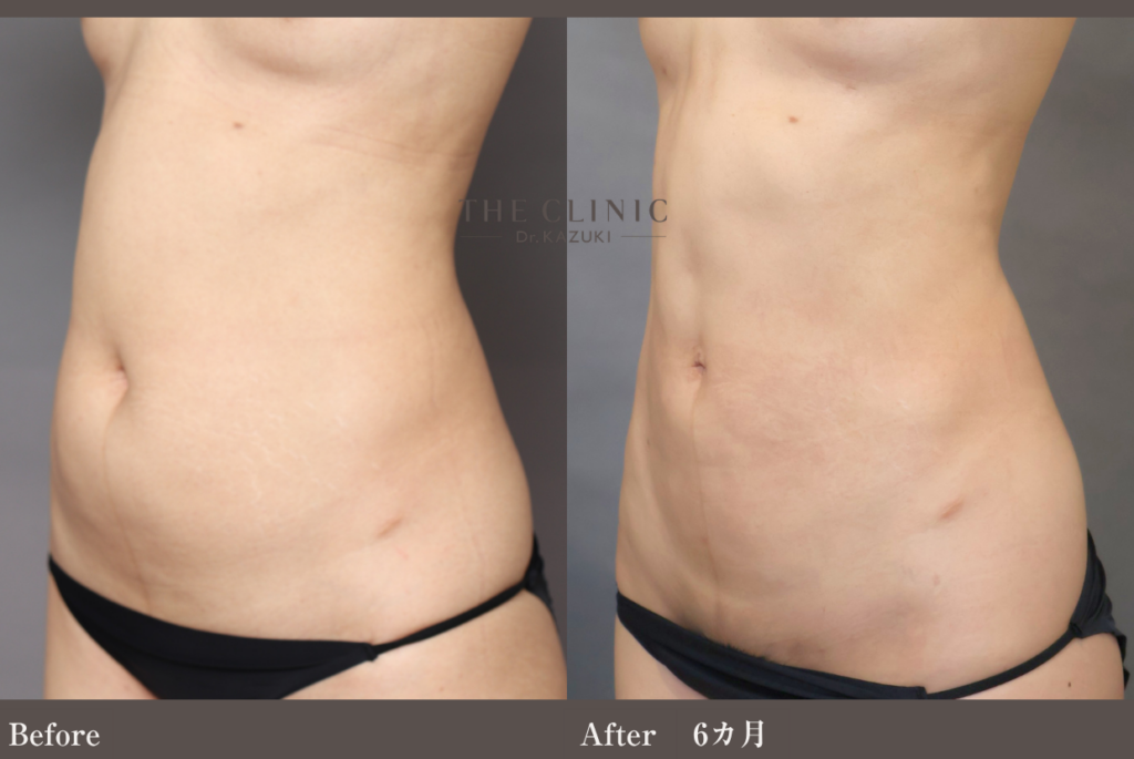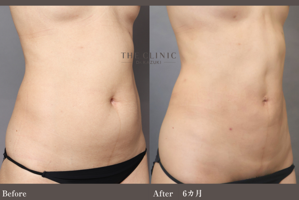 本症例のように皮下脂肪を極限まで吸引する場合、術後は一時的に皮膚が硬くなる「拘縮(こうしゅく)」が強く出ることがあります。これが表面的なデコボコ感として感じられることがありますが、術後半年から1年をかけて組織が馴染み、滑らかになっていきます。