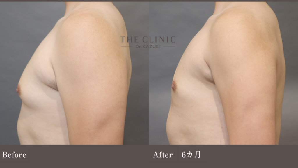 術前のエコーで、乳腺の厚みも確認されましたが、デザインされたベイザー脂肪吸引によるボリュームダウンと皮膚引き締まりにより、胸のふくらみが解消されました。「脇肉前」も一緒に吸引したことにより、脇前の脂肪の膨らみも解消されています。