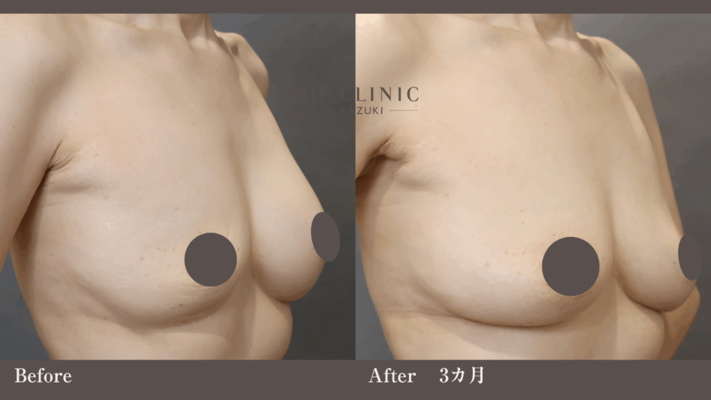 大腿前半周+腰から脂肪吸引を行い、生食バッグ(大胸筋下)を下縁から取り出し、コンデンスリッチ脂肪豊胸を行いました。その後、育胸の脂肪注入を追加しています。240mlの生食バッグが入っていました。