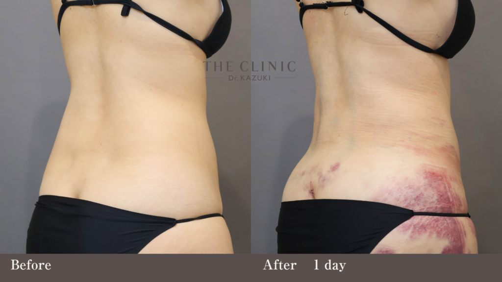 大腿全周・腰のベイザー脂肪吸引を行い、術翌日・4日後・8日後の経過です。内出血・浮腫みはしっかりありますが、浮腫みが取れてくると細くなっているのが分かりますね。