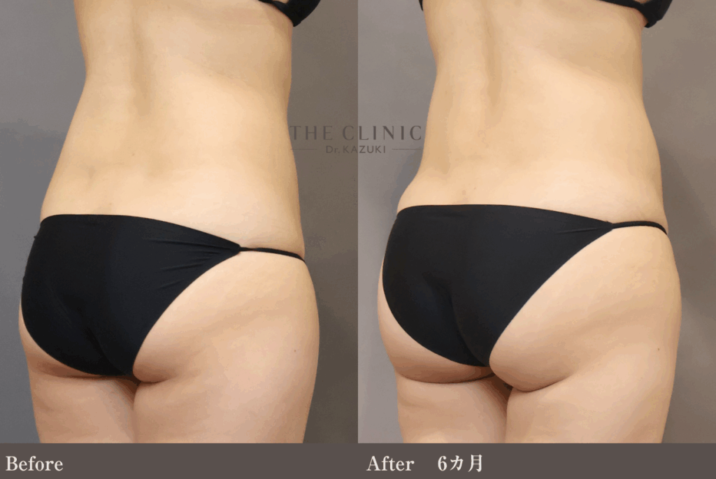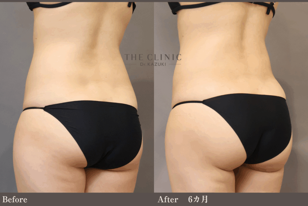 大腿全周、腰、顎下のベイザー脂肪吸引を行っています。腰の脂肪吸引により、お尻の上側の境がはっきりしました。臀部下外側の膨らみをベイザー脂肪吸引(大腿外)で吸引する際は、腰も同時に吸引すると臀部の上下のバランスが取れます。