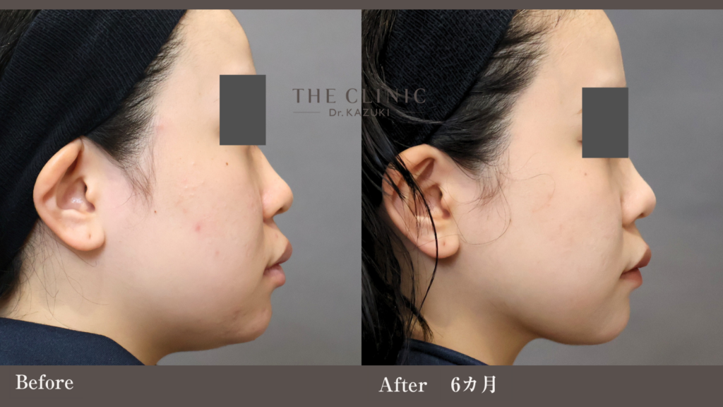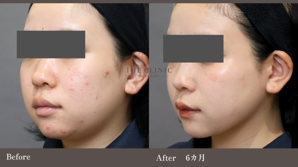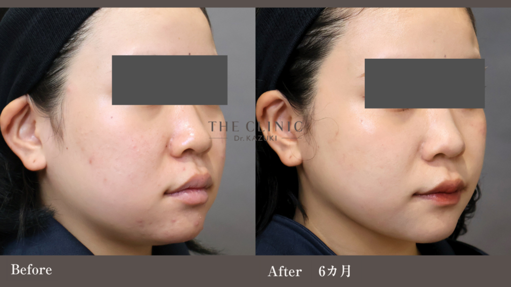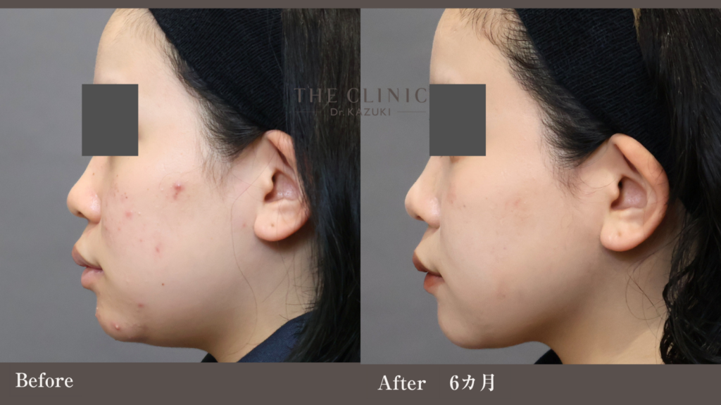 そして、この症例で特筆すべきは、肌質の改善です。術前(Before)は頬や顎下にニキビやニキビ跡が目立ち、肌に赤みもありましたが、術後6ヶ月(After)ではニキビがほぼなくなり、肌の赤みが引いて、トーンアップしています。これは、VASERによる皮膚の強力な引き締め(タイトニング)効果により、毛穴が引き締まり、肌のキメが整った結果と考えられます。