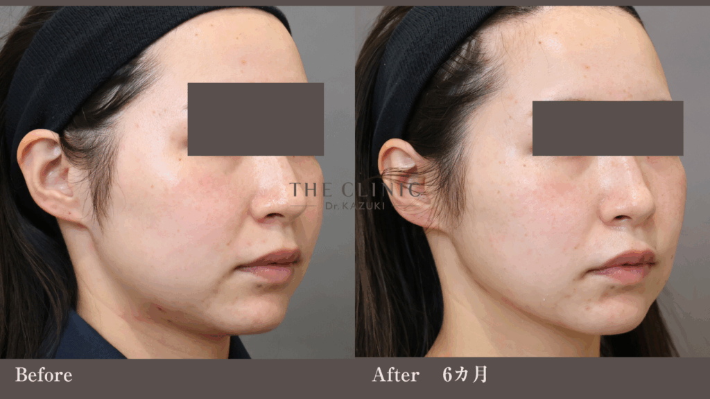 VOVリフト4本を最後に留置して、輪郭を整えています。咬筋(エラ)が張っていれば、ボトックスの併用が推奨されます。頬の皮下脂肪を吸引し過ぎると、月日が経つごとに瘦せこけたような顔立ちになることがあり、注意が必要です。