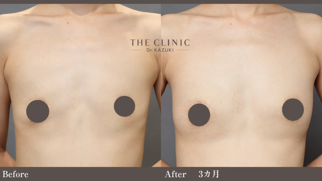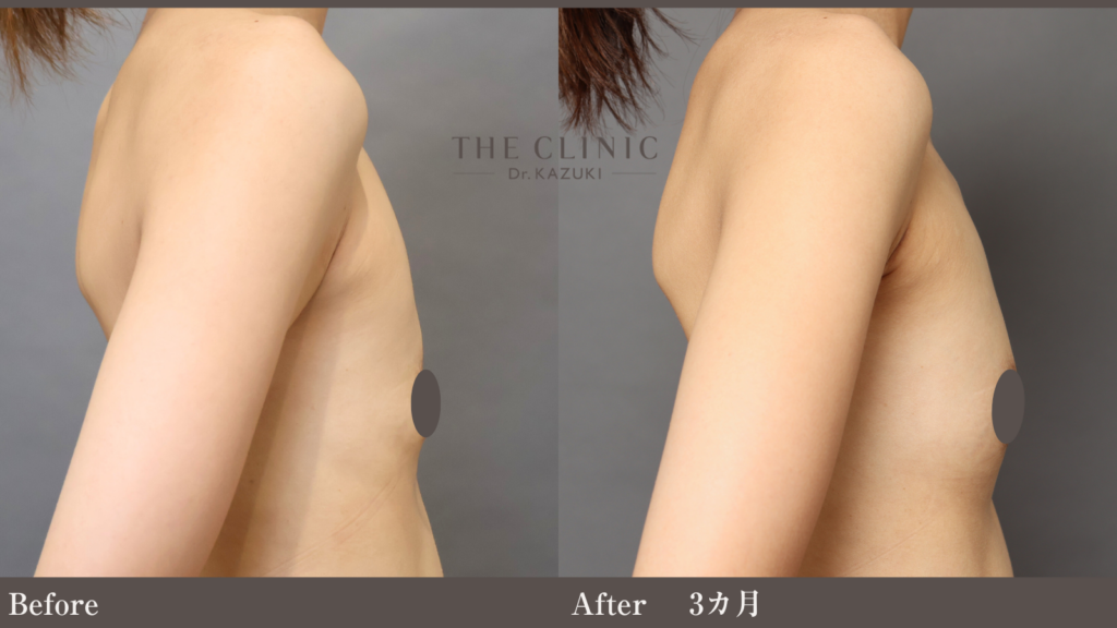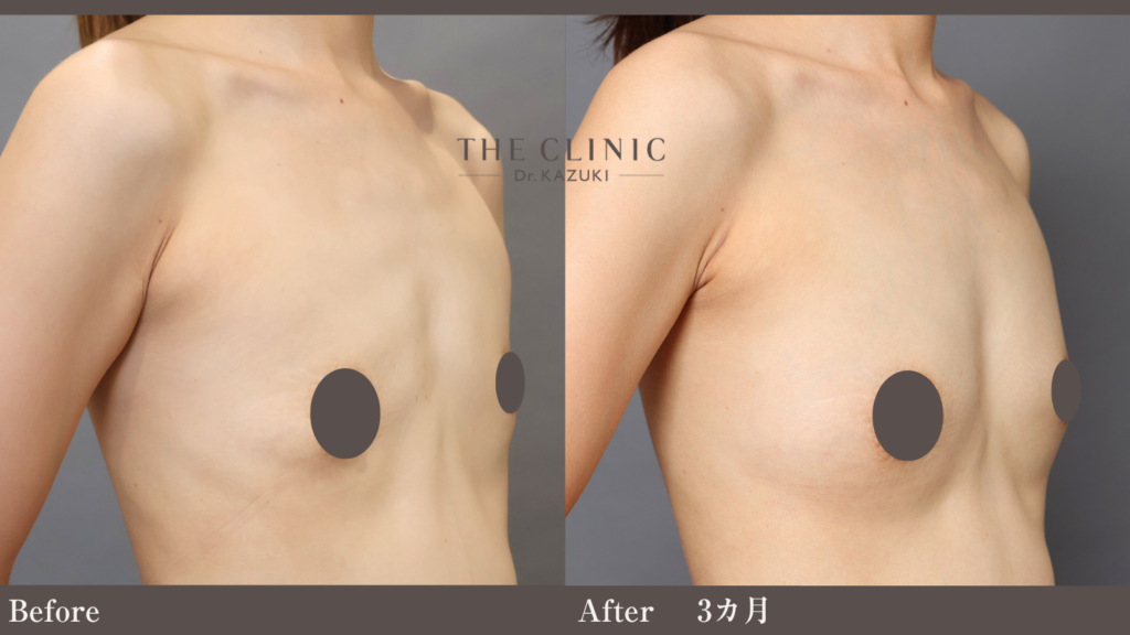 右が少し漏斗胸気味の方です。大腿後ろ半周からベイザー脂肪吸引を行い、バストの深い部分にしっかりとコンデンスリッチファットを注入することで、見た目の改善が得られました。