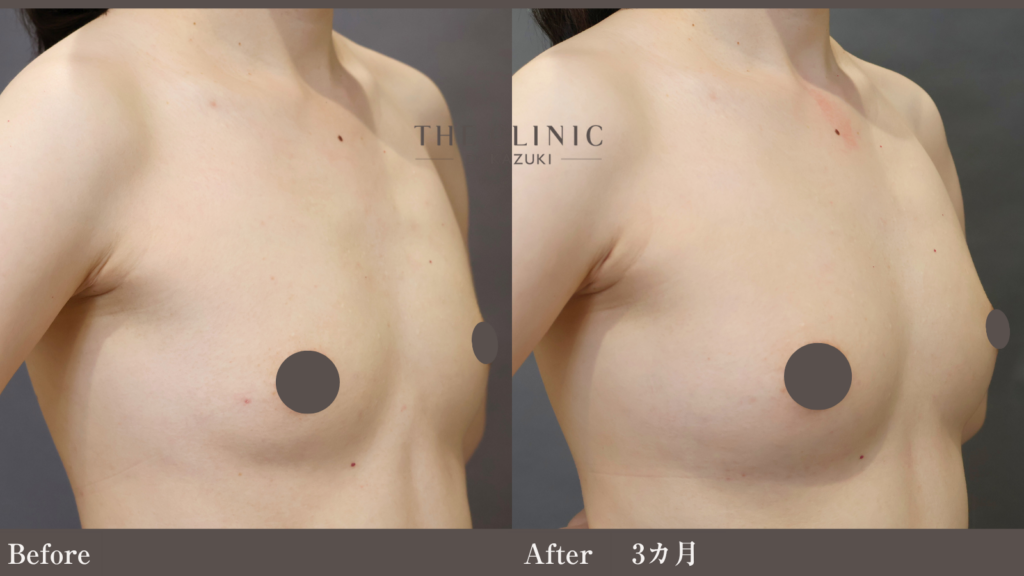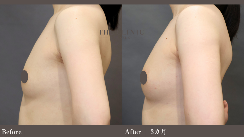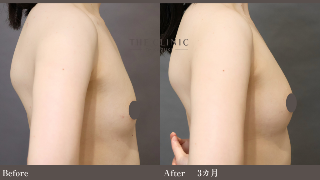 側面や斜めからのアングルを確認すると、デコルテからバストトップにかけてのラインが滑らかに繋がり、人工的な「乗った感」のない、自胸のような自然な仕上がりとなっています。