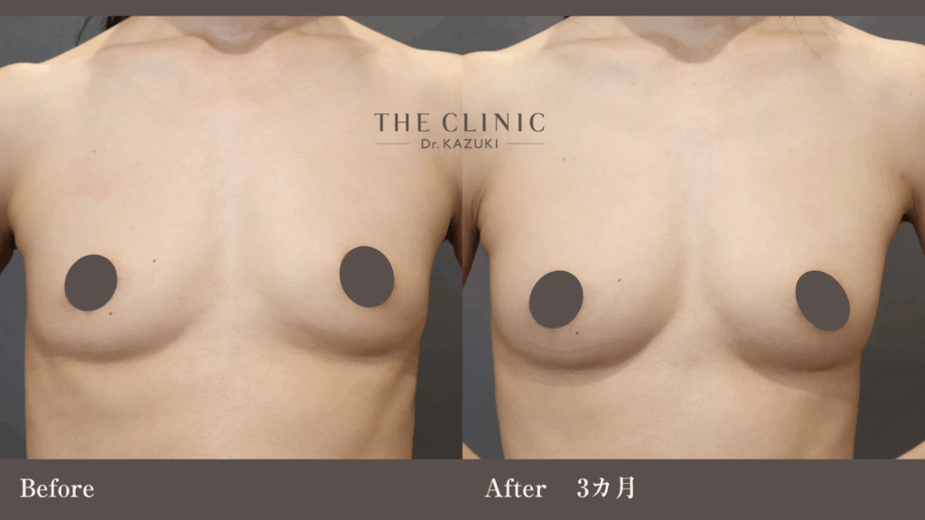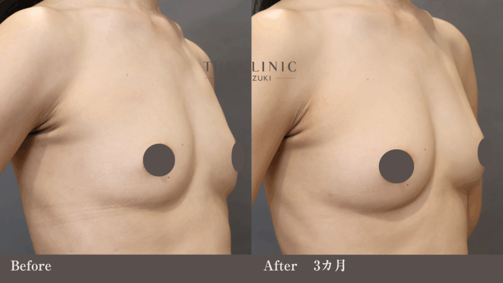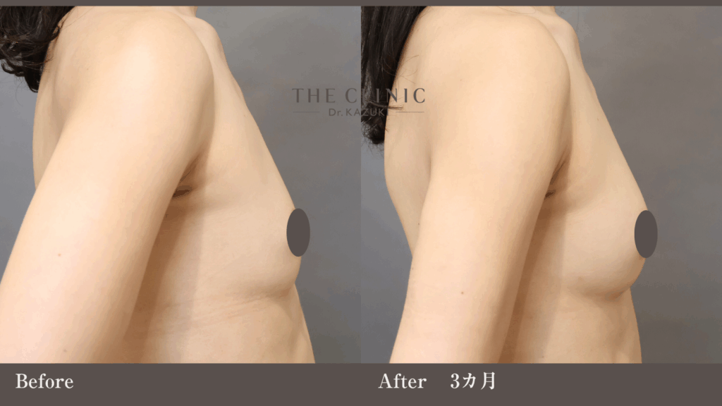 術後1カ月くらいまでに浮腫みの改善と注入脂肪の吸収のため、ボリュームダウンを感じます。そこから術後3か月くらいまで緩やかにボリュームダウンしていきます。術直後が最もバストが大きく、そこから減っていくため、術前との変化が分かりにくく感じる方もおられますが、写真比較すると確かに変化があります。